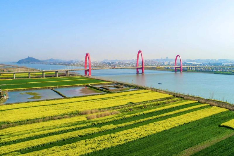 春日正盛,在安徽马鞍山长江大桥边,金灿灿的油菜花在春风中泛起金色的涟漪,带来了浓浓的春天气息。 图片报道:濮 勇