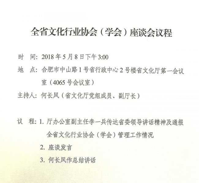 简讯~全省文化行业协会(学会)座谈会,于2018年5月8号下午三点,在省文化厅召开。会议由省文化厅党组成员,副厅长何长风主持。厅办公室副主任李一兵传达省委领导讲话精神及通报了全省文化行业协会(学会)管理工作情况,与会的34家行业协会(学会)的会长,秘书长发言,对今后的工作提出建议。最后厅党组成员,副厅长何长风作总结讲话。省艺术摄影学会副主席兼秘书长吕援朝代表学会参加本次座谈会。